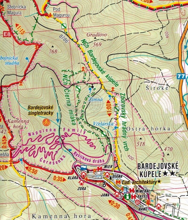 Na mapach widoczne ukształtowanie terenu. Zaznaczono szlaki piesze i rowerowe.