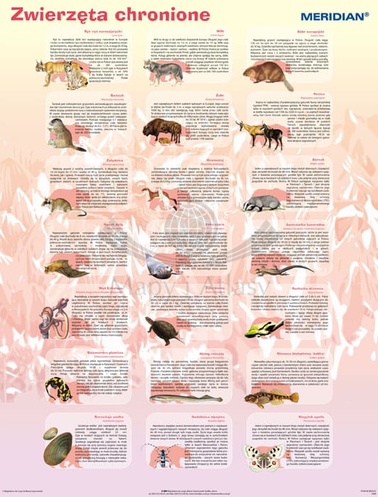 Ścienna plansza edukacyjna do biologii przedstawiająca 21 gatunków zwierząt chronionych w Polsce. Każdy z gatunków pokazany jest na ilustracji oraz opatrzony opisem. Pomoc dydaktyczna do: biologii, nauczania zintegrowanego...